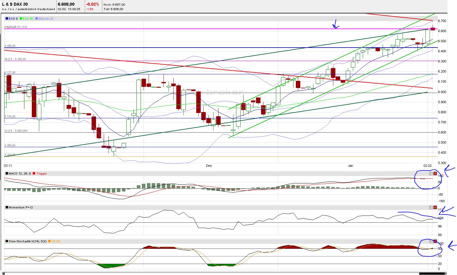 Eine Korrektur könnte erstmal bis zur ema9 oder die untere linie des kurzfristigen Aufwärtstrendes führen (hellgrün) Das wäre dann etwa 6530.