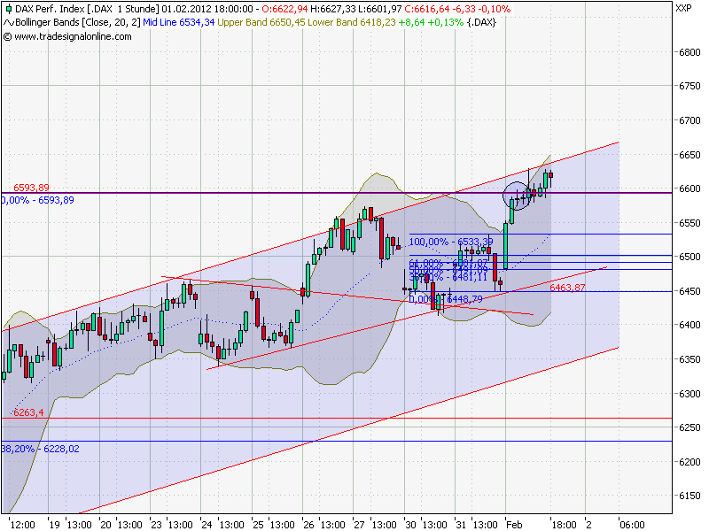 Der Kurs bewegt sich gerade kurz unter der oberen Trendkanallinie. Das 61 Retr. verläuft bei mir etwa bei 6622.