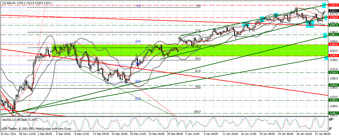 Aus diesem AUTK ist der Future am 30.01.12 kurz herausgetröpfelt, um einen mustergültigen Pullback an den gebrochenen maßgeblichen AWT bei 1298 F auszubilden. Anschließend fand der SP wieder in den AUTK zurück.