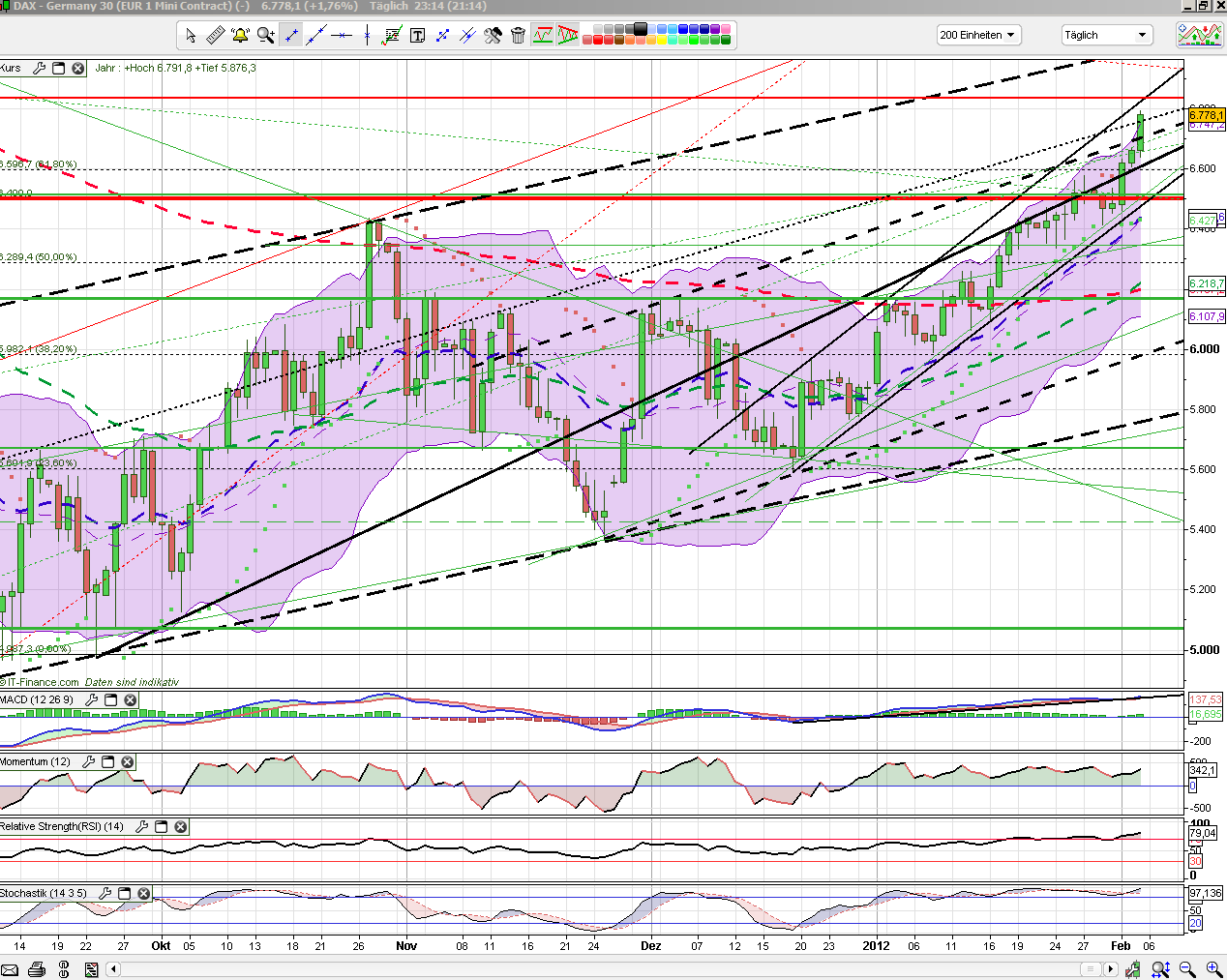 Aus meiner Sicht wäre auf dem aktellen Niveau, nach inem 1000 Pkt Anstieg seit Mitte Dezember, ein Konsolidierung wünschenswert. Idealziel wäre der ausstehende Pullback an den gebrochenen AWT vom JH 2011 , bei aktuell 12366 liegend.