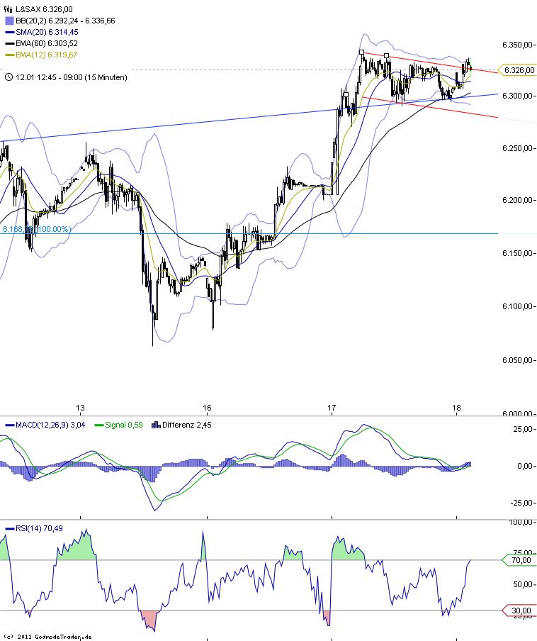 Der aktuelle Longtrend ist bislang ungefährdet. Longversuche werde ich aber erst ab Test des steilen AUT bei aktuell 6195 F vornehmen. Schnelle Finger können auch den Test der EMA 9 bei aktuell 6264 F Long traden.