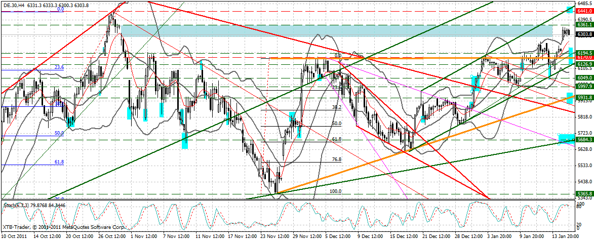 Der Ausbruch aus dem steigenden Dreieck scheint in einem AUTK zu erfolgen, dessen Begrenzungen mehrfach getestet wurden. Die untere AUTK Begrenzung liegt aktuell bei 6127 F, aber stark ansteigend. Pro Tag zirka 36 Pkt. ansteigend. Dies korrespondiert also mit der Horizontalunterstützung bei 6170 F