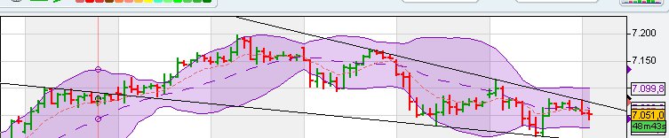 Die RBL liegt heute bei 7049, die EMA 9 bei aktuell 7042. Da die EMA 9 nicht mehr ansteigend ist, verliert sie aber aus meiner Sicht an Bedeutung. Das mBB liegt bei aktuell 6940.