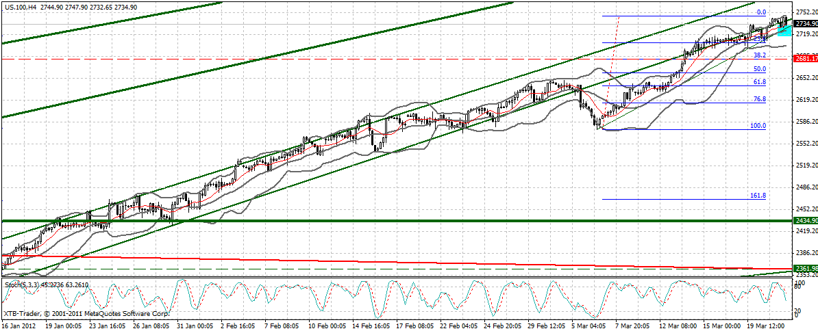 Seit Jahresanfang zog er im steilen AUTK seine Bahn. Nach dem Trendbruch erfolgte aber keine größere Reaktion, sondern der NDX hangelt sich nun seit Wochen an der gebrochenen unteren AUTK-Begrenzung entlang. Durch den neuen Rallyimpuls hat sich einer neuer, steiler AUT gebildet, der aktuell bei 2728 F liegt.