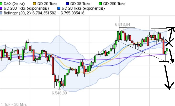 Nach temporärer Rücksetzer beim kurzfristigen AUT kam es gestern bei 6815 F zu einem bärischen Rücklauf, von dem aus der kurzfristige Trendbruch erfolgte und der Dax F leider wieder unter die HU 6732 F rutschte. Im nachbörslichen Handel wurde sogar die darunter liegende HU bei 6666 F unterboten. TT waren 6636F. SK waren 6668 F