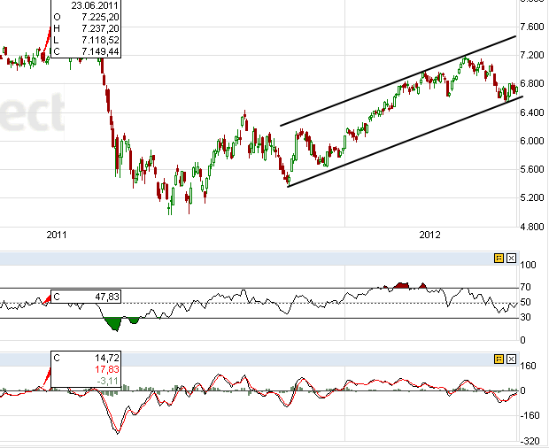Man könnte die beiden kurzfristigen Trends auch als symmetrisches Dreieck ansehen und erst bei Ausbruch, die Ausbruchsrichtung traden.