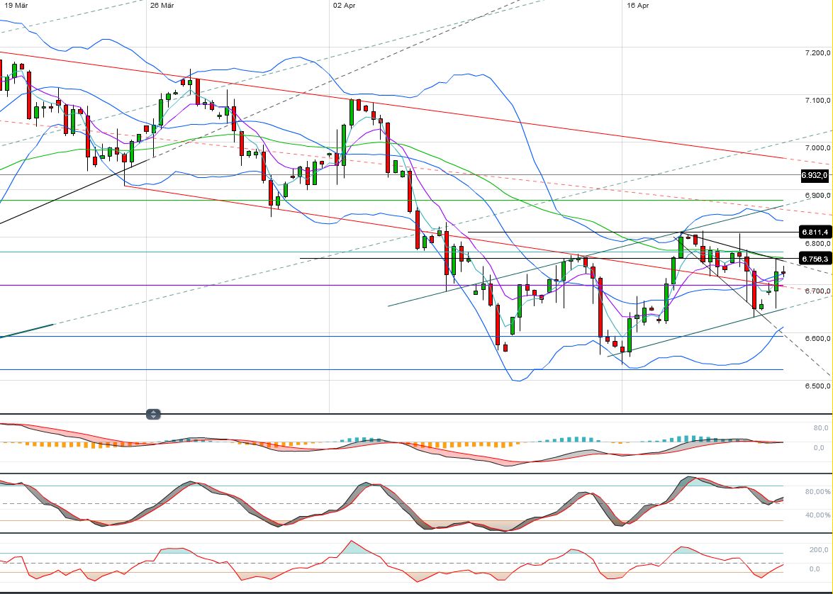 Aus meiner Sicht hat der DaxF zum Mindestziel des DJ F noch Platz nach oben und sollte daher bei Erreichen des mehrwöchigen ABT im DJ F bei 6780 F notieren. Dort dürfte es einen Abprall geben oder bei Überreibung an der beschriebenen Schaltstelle 6815 F.