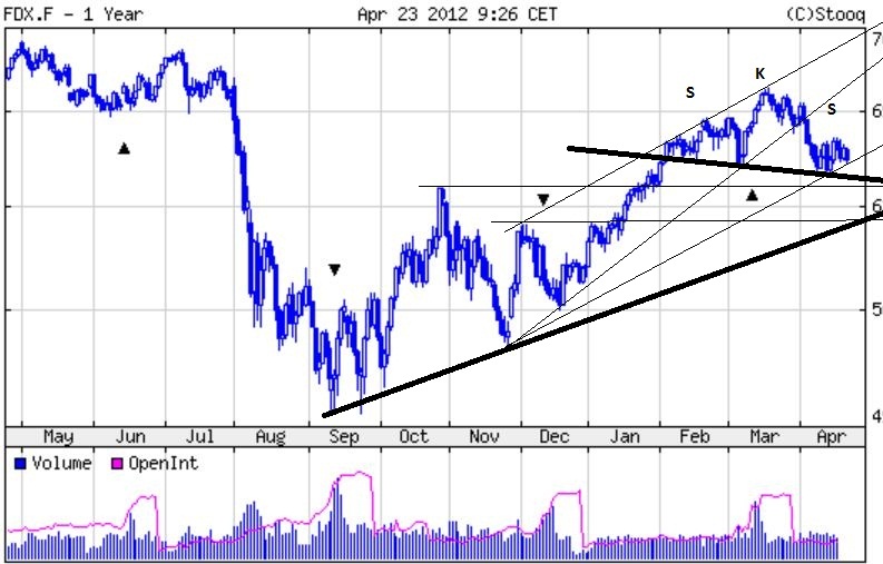 Zur Oberseite ist er zwischen dem 62ige rund 76iger am mehrwöchigen ABT abgeprallt. Zur Unterseite hält eine kurzfristiger AUT,der aktuell im Bereich des alten JH 2011 bei 12871 F liegt.