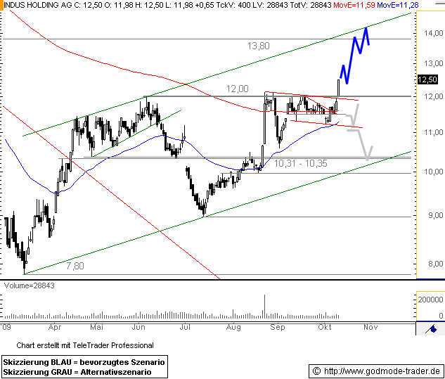 Rückblick: Die Indus Holding Aktie erreichte im August und im September wieder das Jahreshoch bei 12,00 Euro und konsolidierte mehrere Wochen unterhalb davon. Vergangene Woche haben wir in unserem Premiumbereich auf das explosive Chartsetup hingewiesen und eine klare Prognose gesetzt (s. angehängte Chartgrafik).