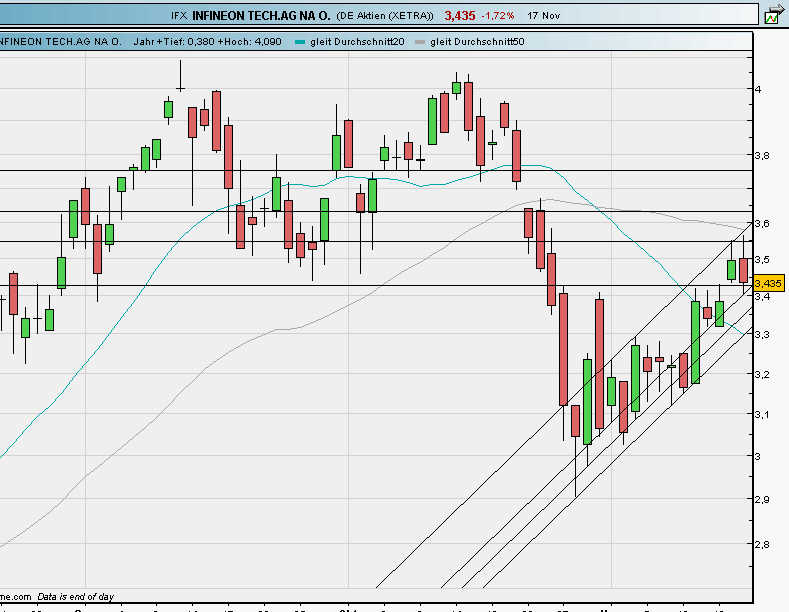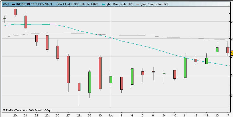 Die Aktie des Münchener Halbleiterkonzerns Infineon ist mit hohen Gewinnen in die neue Woche gestartet, legte am Montag bis in die Abendstunden hinein um 3,2 Prozent zu und schloss bei 3,495 Euro und damit deutlich über der Widerstandszone um 3,40 Euro. Zwischenzeitlich fiel das Plus sogar noch deutlich höher aus, betrug knapp fünf Prozent. Zu diesem Zeitpunkt notierte die Aktie mit 3,55 Euro so hoch wie zuletzt am 26. Oktober. Doch darauf kommt es nicht an. Entscheidend für den weiteren Kursverlauf ist und bleibt, ob das Papier das am Montag generierte Kaufsignal bestätigen kann...