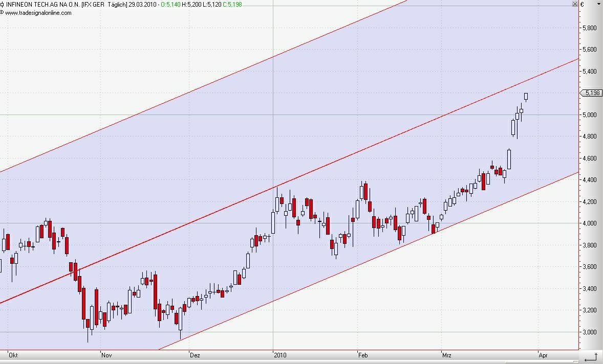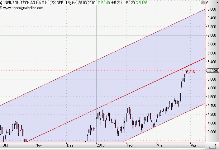 "Die Analysten bei Merck Finck & Co. haben ihre Verkaufsempfehlung für Infineon zurück gezogen und sind ins Bullenlager gewechselt. Die Aktie des Chipherstellers wird ab sofort mit „buy“ eingestuft. Merck-Finck-Analyst Theo Kitz sieht das Kursziel für den DAX-notierten Titel nun bei 5,60 Euro. Nach einem Verlust von 0,32 Euro je Infineon-Aktie im Jahr 2009 wird für 2010 ein Überschuss von 0,19 Euro erwartet. Der Gewinn je Infineon-Aktie soll 2010 auf 0,31 Euro klettern und 2012 auf 0,35 Euro.