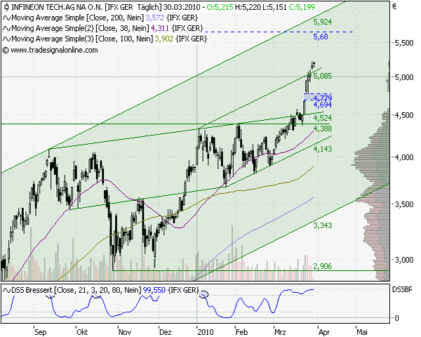 Verbindet man die markanten Hochpunkte vom Juli und September vergangenen Jahres ergibt sich eine Trendlinie, die derzeit bei knapp sechs Euro verläuft. Zudem kann auf der Unterseite eine Parallele bei 3,34 Euro eingezeichnet werden. Ob diese Marke aber im ersten Anlauf bereits erreicht wird, ist eher zweifelhaft. Der DSS Bressert notiert bereits seit Anfang März im überkauften Bereich. So lange der Indikator aber nicht in den neutralen Bereich dreht, sind weitere Kursgewinne wahrscheinlich. Kommt es zu einer Korrektur, verläuft die erste schwache Unterstützung bei rund fünf Euro. Als wesentlich Signifikanter ist aber eine Gerade bei 4,52 sowie das Ausbruchsniveau bei 4,39 Euro zu werten. Knapp darunter verläuft zudem die 38-Tage-Linie bei 4,31 Euro.