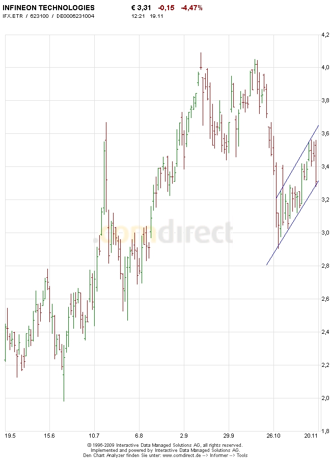 Trotz eines Quartalsergebnisses über Markterwartungen konnten Infineon ihre Anfangsgewinne nicht halten. Die Titel des Chip-Herstellers waren mit einem Minus von 3,3 Prozent auf 3,35 Euro Dax-Schlusslicht, nachdem sie im frühen Geschäft zeitweise größter Gewinner gewesen waren. Er sei überzeugt, dass die Erträge im abgelaufenen Quartal ihren Gipfel erreicht hätten, schrieb Analyst Jürgen Wagner von Sal. Oppenheim. Außerdem sei die Aktie überbewertet. Andere Börsianer verwiesen zusätzlich auf einen negativen Kommentar von BofA/Merrill Lynch zum US-Halbleitersektor.