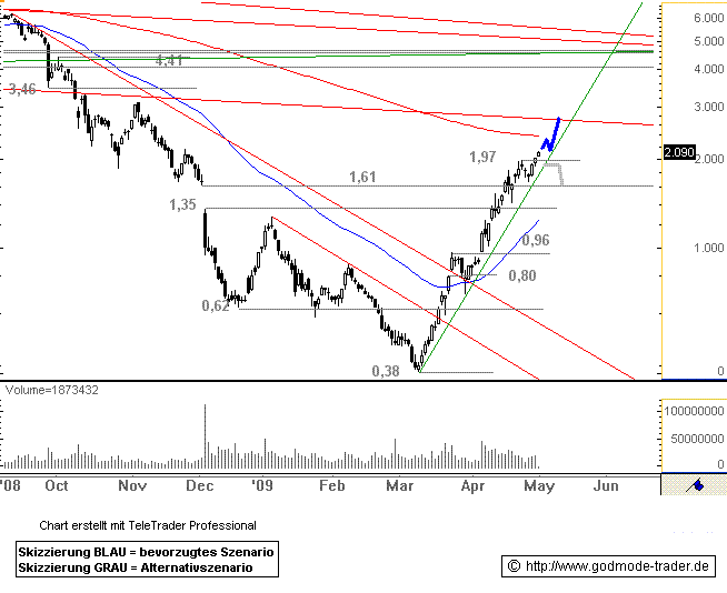 Seit diesem Tief befindet sich die Aktie in einer sehr, sehr steilen Rallye. Am 14.04. deutete sich am Widerstandsbereich um 1,35 - 1,61 Euro ein Ende dieser Rallye an. Diese blieb aber nur eine Andeutung, starke Verkäufe setzten nicht ein. Vielmehr setzte die Aktie in den letzten Tagen ihre Rallye fort.