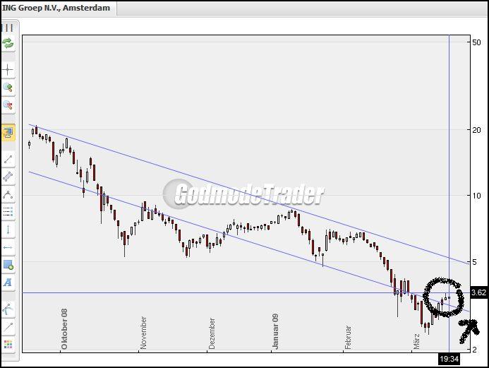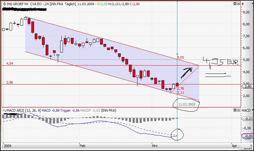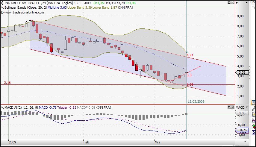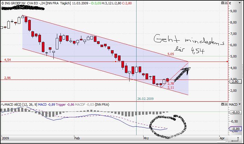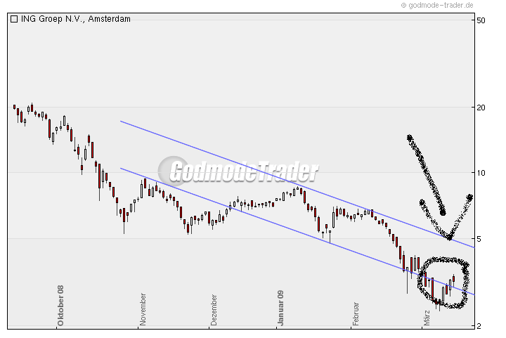 Wie es aussieht ist dei Trendwende nun doch endlich eingeleitet. Kann ja auch kaum sein dass die Unternehmenswerte noch weiter fallen. Sind laengst bei weit weniger als 10 % der Hoechststaende vor ca 18 Monaten. Das ist doch eigentlich laecherlich angesichts der Verluste von nur ca 500 Mio in 2008. Diese Woche kommt noch der Optionsverfallstag am Freitag da werden sich dann einige Shorties die Finbger gewaltig verbernnen wenn die Ralley anhaelt. Davon ist aber auszugehen denn eine Stabilisierung der Finanzmaerkte zeichnet sich doch jetzt immer deutlicher ab. Eine Bank nach der anderen meldet einen guten Start ins Jahr 2009. CITIBank hat gestern nochmals circa 25 % zugelegt voruebergehend sogar knapp 40 %. Und die haben doch sicher viel groessere Probleme als die ING. Ich bleibe Optimist und sage das Aufholpotenzial ist gerade bei ING noch mindestens doppelt so hoch wie bei der DB. DB sehe ich bei 40 - 50 noch dieses Jahr. Ing irgendwo zwischen 5 und 10 Euro. Coba war mal meon Favorit letztes Jahr aber die haben einen auf Aktionaersverarsche gemacht. Keine Dividende und enorme Zinsleistungen an die Bafin. Da bin ich zum Glueck schon im November raus. ING zahlt zwar auch fuer die Garantien aber nur circa 60% des COBA-Betrags und man muss ganz klar sehen, die ING verdiente im Schnitt der letzten 5 Jahre fast immer circa 4 mal soviel wie die COBA. Was heisst fuer Coba Aktionaere bleibt auf langere sicht wenig zum Verteilen fuer ING shareholders sicherlich wesentlich mehr, vermutlich sogar mehr wie bei DB shareholdern.