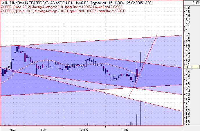 Und ich rate allen die Papiere zu halten. Init wird scheinbar gerne in Trends gehandelt und momentan sieht es nach einem kurzfristigen Up aus. Zahlen waren im Rahmen der Erwartungen, da wurde Kasse gemacht. Mal zur Entscheidungshilfe ein Langfristchart und und die Lupe daraus für die vergangenen Wochen. Für den Fall, daß der äußerst steile Aufwärtstrend sich nicht als Fake herausstellt, wäre ab ca. 3,15 Euro wieder Platz nach oben. In dem Bereich unbedingt auf das Volumen achten, wenn da abverkauft wird sollten ebenfaslls Gewinne realisiert werden. Absichern würde ich z.Zt. bei 2,50 Euro bzw. spätestens 2,40 Euro.