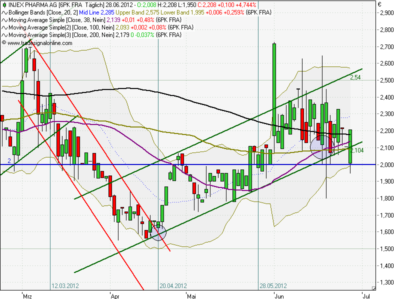 Und damit alles beieinander ist, nochmal der Hinweis darauf, dass der Kurs gestern an der 2,- Euromarke abgeprallt ist, nachdem er kurzzeitig abgetaucht war.