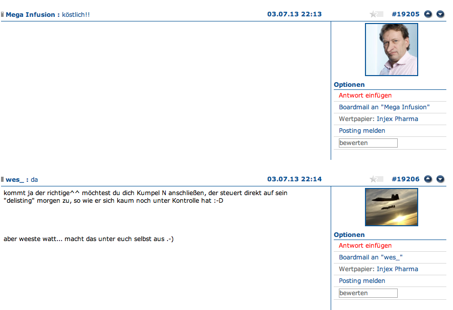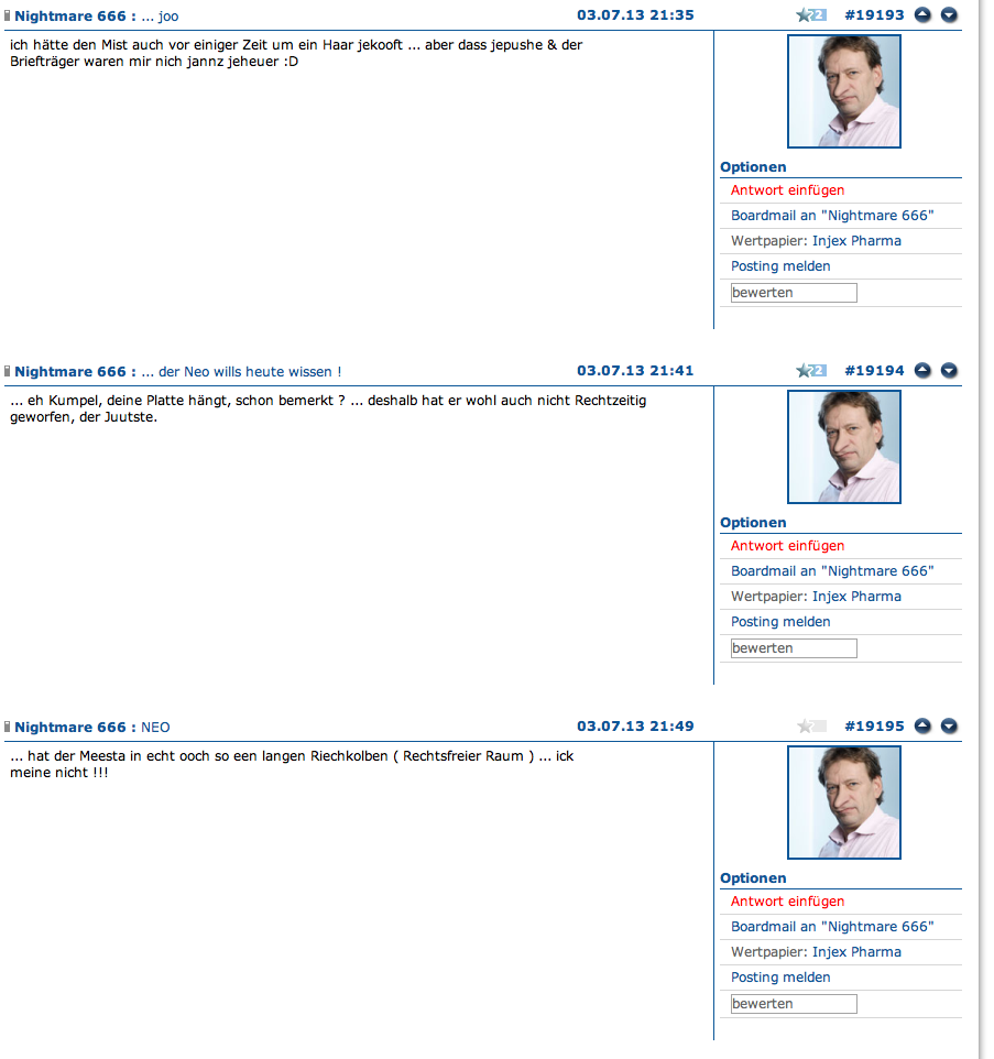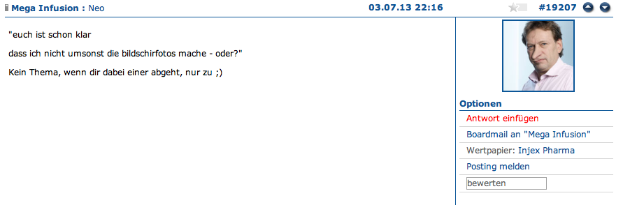 Und bei mir hast Du überhaupt nicht aufgepasst oder gar nichts verstanden. Ich war seit Juli 2011 investiert (mit der Absicht lange drinne zu bleiben und vor allem mich an Dividenden zu erfreuen). Ich habe lange zu diesem Invest gehalten, wurde aber aufgrund meiner neugierigen Fragen, die mich anfangs wirklich beschäftigten, sofort in die "böhse" Basherecke gestellt, mir wurden fiese Spielchen unterstellt (warum weiß ich bis heute nicht). Jedenfalls wurde ich von den Pro's (nichtmal von den vernünftig wirkenden) aktzeptiert oder verstanden. Mit der Zeit hat sich meine Meinung grundlegend zur Paketeria/ zu Injex geändert. Irgendwann war und bin ich tatsächlich ein Skeptiker und Gegner dieses Invests geworden und bin zum Glück mit kleinem Plus meine Aktien noch rechtzeitig vor dem durch die Pro's absolut unerwartetem Delisting, geschweige denn von dem mehr als halbjährlich so bleibenden Zustand losgeworden.