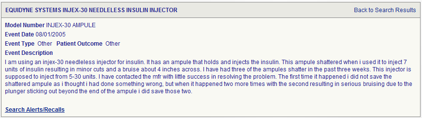Quellenangabe: Maude Adverse Event Report: EQUIDYNE SYSTEMS INJEX-30 NEEDLELESS INSULIN INJECTOR www.accessdata.fda.gov/scripts/cdrh/cfdocs/...drfoi__id=751543