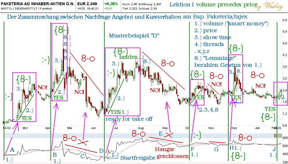 Steigt die Nachfrage an shares dieses kleinen open market Wertes über ein kritisches Maß (Schwellenwert, blau kreuzt rot und bleibt drüber) bekommt der Kurs Flügel (jeweils eingerahmt in den rosa Kästen, mit dem smiley {8-) bzw. seine Freigabe zu steigen, wir drüben in der Flugschule sagen, er bekommt sein "ready for take-off" und dann hebt der Flieger ab :-) immer gut den Funkverkehr zwischen Tower und Flieger mitzuverfolgen... in den threads werden sie sagen, "du brauchst so ein Funkgerät nicht" "hab Vertrauen" "es wird sicher bald alles gut" :-))) das heißt übersetzt, die eigentlichen Strippenzieher in vielen Werten, haben panische Angst, dass du den Funk überwachen könntest :-) deswegen werden sie dich beschwichtigen wollen... und dein Interesse daran tunlichst zu zerstreuen suchen :-)