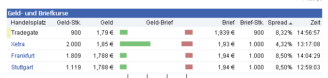 @bierro Meldung eines Regelverstoßes: Melder: tnzs72 Zeitpunkt: 23.05.12 13:34 Grund: Irreführend da kein Datum und Uhrzeit erkennbar. 10 Minuten nach dem Posting sah und sieht die Sache nämlich schon ganz anders aus. Abgesehen davon betrug der Spread nicht an allen Handelsplätzen fast 10% => Xetra rund 4%. Posting will aber genau dies suggerieren. Danke fürs Löschen dieses weiteren Basherpostings des Users. Meldung eines Regelverstoßes: Melder: Resol_i Zeitpunkt: 23.05.12 14:31 Grund: was soll dieser spam?