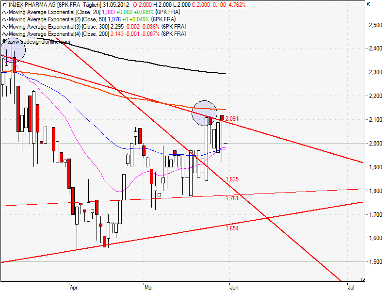 Der Kurs schließt kurz über der Begrenzung bei 2,10€ ist aber sehr Bärisch zu werten, da er das Hoch heute bei 2,12€ nicht halten konnte.