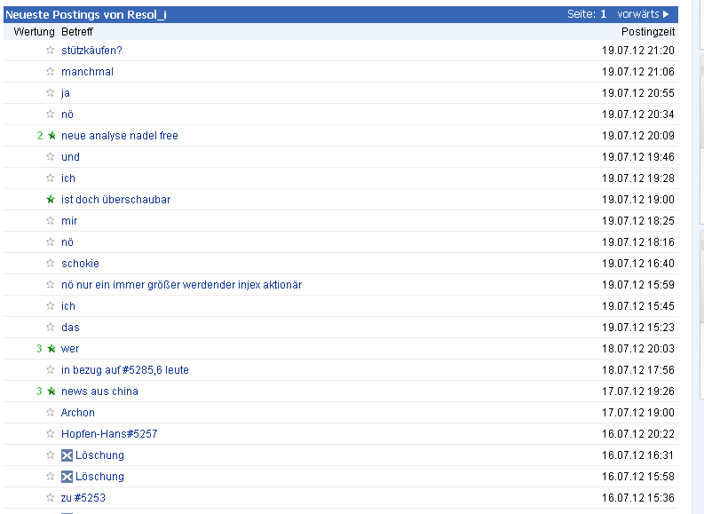 | Wertung | Antworten | Thema | Verfasser | letzter Verfasser | letzter Beitrag | |
