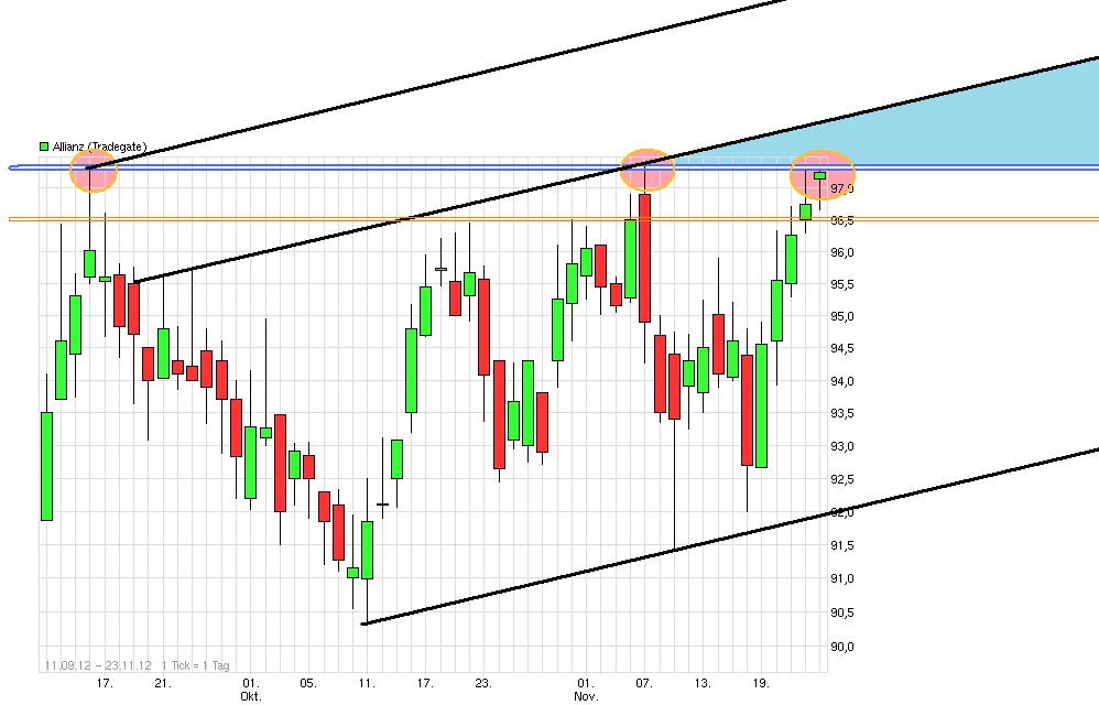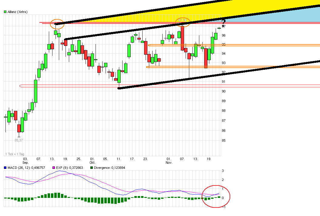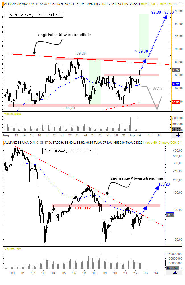 Die Aktie der Allianz befindet sich in einer mehrtägigen Seitwärtsbewegung und bricht dabei heute innerhalb der Handelsspanne über die Vortageshochs aus. Die Aktie notiert damit nicht mehr weit vom Rallyhoch bei 89,26 Euro, unterhalb dessen auch die langfristige Abwärtstrendlinie verläuft.
