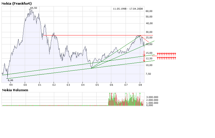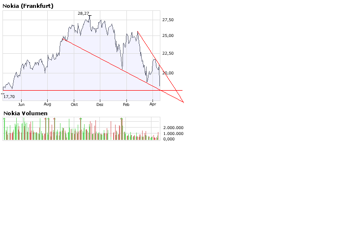 Der finnische Handyhersteller Nokia konnte Umsatz und Gewinn im ersten Quartal 2008 im Vergleich zum gleichen Quartal des Vorjahrs deutlich steigern, sorgte an den Finanzmärkten aber trotzdem für schwer enttäuschte Gesichter. Analysten hatten nach dem Rekordjahr 2007 zum Jahresbeginn mit einem besseren Ergebnis gerechnet und zeigten sich auch wegen des stärker als erwartet gefallenen Durchschnittsverkaufpreises für Handys besorgt. Das schlug sofort auf den Kurs der Nokia-Aktie durch. Zeitweise sackte das Papier um rund zehn Prozent ab, fiel unter 20 Euro und setzte damit auch den Dax unter Druck.