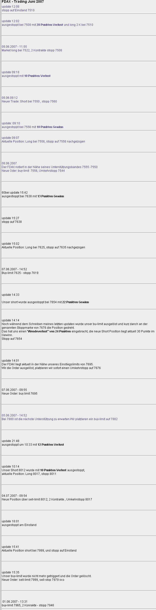 ROTTER: Nein, meines Erachtens kann ein einzelner Marktteilnehmer die Märkte niemals rund um die Uhr alleine im Griff haben. Es gibt immer mehrere Big Players im Markt. Nehmen Sie beispielsweise den Bund Future, den umsatzstärksten Futures-Kontrakt der Welt. Es werden fast täglich über eine Million Kontrakte gehandelt. Wenn beispielsweise aus dem nichts heraus ein Trend einsetzt, ohne große Korrekturen zu zeigen, könnte ich mich dagegen stellen, wie ich wollte. Ich würde den Markt trotzdem nicht aufhalten können, weil dahinter viel größere Kräfte wirken als ich sie aufbringen kann. Außerdem haben sich seit einiger Zeit so genannte “Analytics”(computergestützte Orderbuch-Scalper) hinzugesellt, die auch mir das Leben schwerer machen. Meines Wissens erforschen sie systematisch die Eigenarten und Verhaltensweisen des Orderbuches und setzen die Erkenntnisse daraus in Form von voll automatisierten Handelssystemen um. Weil sie oftmals in mehreren Märkten gleichzeitig agieren, vermute ich, dass diese Computer-Freaks aus dem voll automatisierten Spread- und Arbitrage-Handel kommen.