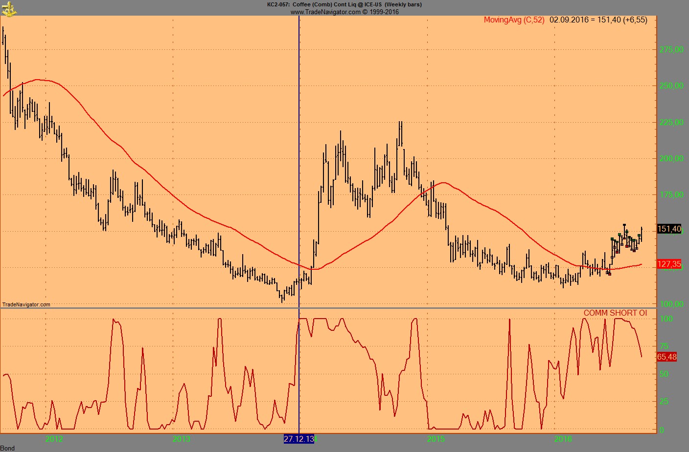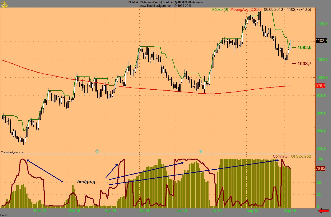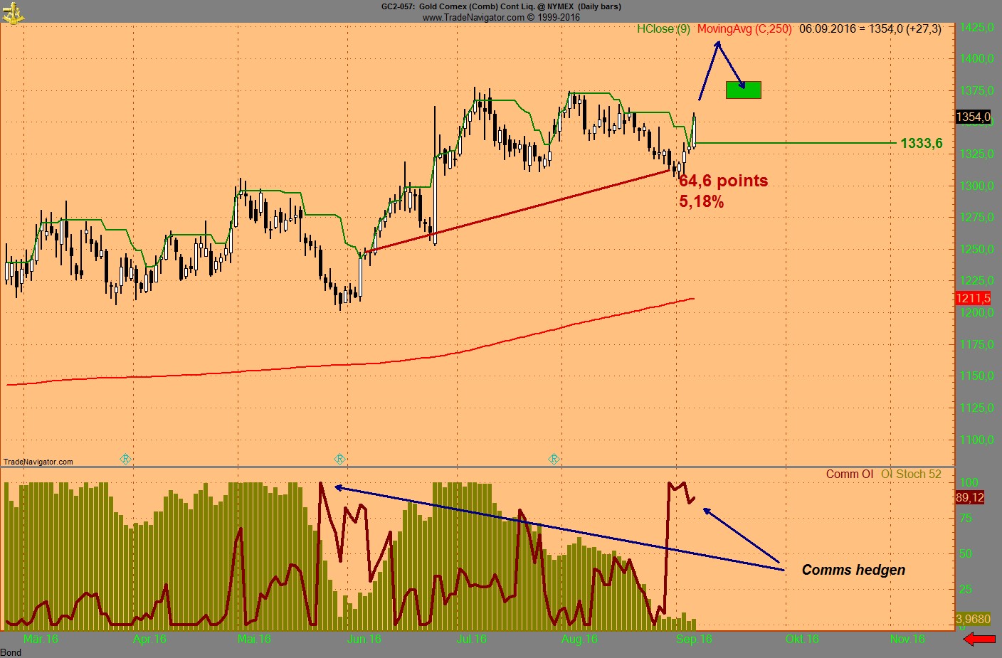Wie mann unweigerlich sieht steht das OI der Verkaufe von den Commercials auf 100, (COMM SHORT OI in rot)....das heisst sie hedgen sich den Preis von jetzt....und das machen sie nur bei Preishochs!!!
