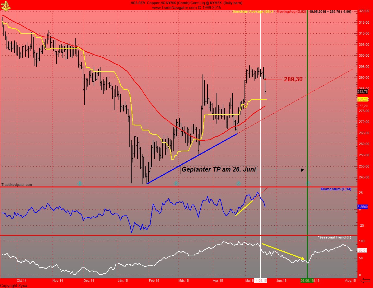 Und da waere dann noch die Seasonalitaet, die bis ende Juni sehr negativ ist fuer Kupfer...ich hab das Zeitfenster fuer mein Shorttrade markiert(gelb).....Ich bleibe bis 26. Juni short, es sei denn ich werde ausgestopt