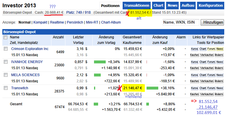 oben rechts der alte Gesamtbestand 81.552,54 € (von vor der Rückeinbuchung TranSwitch Position) unten Mitte die neue TranSwitch Position (als sie eben noch da war :-))) zusammen unten rechts neuer Gesamtbestand, dazu muss oben links mehr cash stehen, nämlich: 102.699,01 - 66.764,53 = 35.934,48 € nur... inzwischen ist die Posi wieder "verschwunden"^^ lol das Spiel fängt langsam an Spaß zu machen :-)