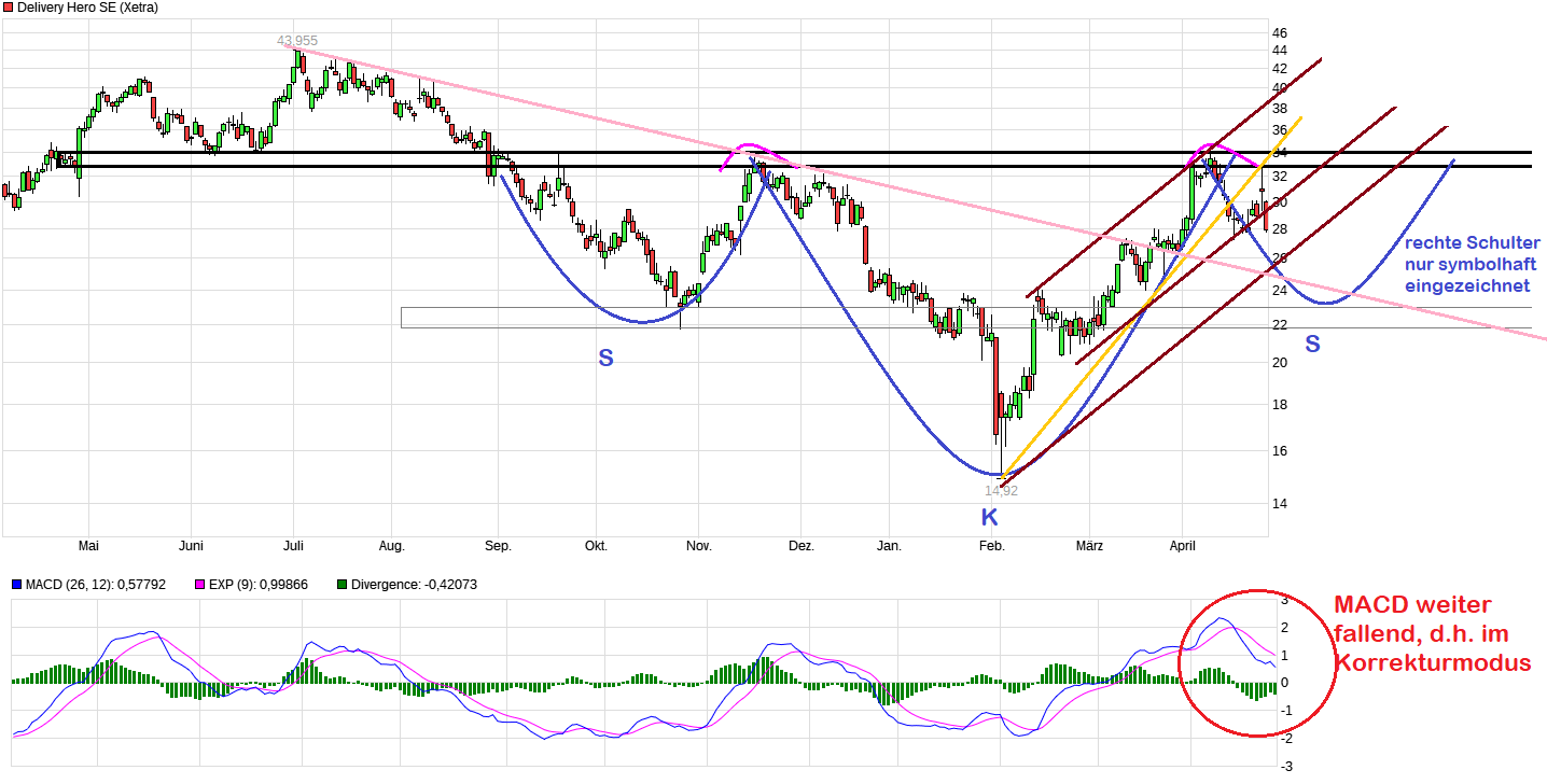 Also ich sehe noch keine ausgebildete inverse SKS. Man könnte aber z.B. im Bereich um 34 Euro hypothetisch eine Nackenlinie einer sich in der Entwicklung befindlichen SKS annehmen und eine bereits ausgebildete linke inverse Schulter und einen ausgebildeten Kopf unterstellen. Dann wäre man jetzt aktuell dabei die linke inverse Schulter zu bilden. Wie tief die geht wäre abzuwarten. Sollte nur nicht tiefer als die linke Schulter werden. Sollte man dann wieder über 34€ klar ausbrechen. d.h. die Nackenlinie knacken, dann wäre das ein Kaufsignal. Aber natürlich ein völlig ungelegtes Ei. Da muß man erstmal warten was sich wirklich weiter ausbilden wird. Jedenfalls zeigt der fallende MACD an, daß noch immer keine klare Wende der laufenden Korrektur vollzogen wurde. Angesichts des extremen Anstiegs von über 100% in kurzer Zeit, ist es aber auch nicht verwunderlich, wenn eine Konsolidierung dann nicht in wenigen Tagen schon wieder durch ist. Von daher ist hier vorerst Geduld angesagt. Könnte eben auch noch etwas länger/tiefer gehen.