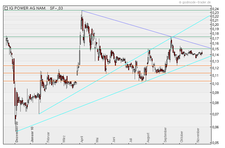 Hier gilt folgendes. Es etabliert sich nicht nur ein Dreieck, sondern gleichzeitig auch noch ein Trendkanal (hellblau), der aber nicht komplett parallel verläuft. Normalerweise bewegt sich ein Kurs in diesem Trendkanal bis er irgendwann in eine Richtung ausbricht. Als Ziele könnten durchaus die eingezeichneten Widerstände im Bereich um 0,150 0,173 und im Idealfall sogar bis zum Jahreshoch von 0,236.