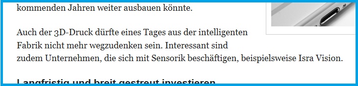 Die beiden Hauptgeschäftsfelder Surface/Robot Vision sind allemal zukunftsträchtig. Das letztere offenkundig deutlich renditestärker, weshalb Cognex sich kürzlich auch von ersterem getrennt hat (Cognex machte zuvor im Gegensatz zu ISR deutlich mehr Umsatz auf dem Gebiet Robot als Surface).