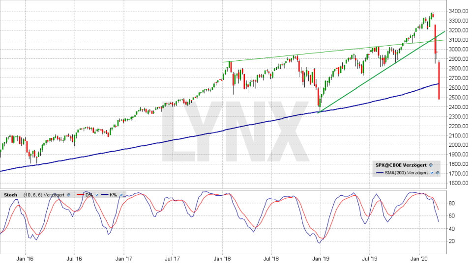S&P 500 Chart auf Wochenbasis vom 12.03.2020, Kurs 2.480,64 Punkte, Kürzel SPX | LYNX Online-Broker