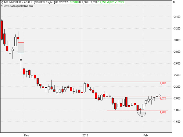 Nach einer Kapitalerhöhung und leicht negativen Fundamentaldaten rutschte IVG gegen Ende des vergangenen Jahres deutlich ab. Selbst im Januar 2012 ging es weiter in den Keller – während alle anderen Aktien längst in Richtung Norden drehten. Erst vor zwei Wochen markierte die Aktie ein neues Jahrestief knapp unter 1,80 Euro.