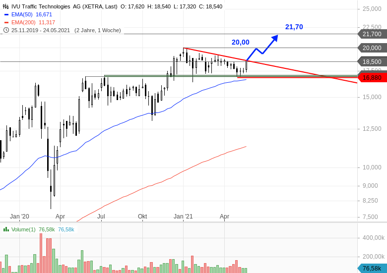 - die 200 Tage-Linie (SMA) am 6.5.2021 bei 16,88 EUR einmal getestet