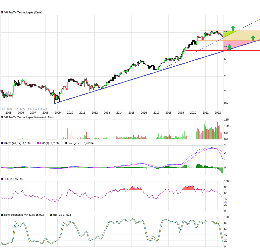 Nehmen wir mal makroökonomisch schwierigere Zeiten für 3-4 Jahre an, in denen der Aktienmarkt nach einem Tief 30% unter den jetzigen Kursen in eine längere Seitwärtsphase übergeht. Dann würde ich sagen, dass IVU aufgrund der Marktstellung/Preismacht outperformen wird, aber dennoch eher diese 3-4 Jahre zwischen 13,1 und 21,9 € seitwärts läuft. Allerdings denke ich, dass der Markt derzeit zu negativ denkt. Der Ukrainekrieg wird genauso wenig ewig dauern (hoffen wir es) wie Lieferengpässe aus China. Deshalb wird sich auch das Thema Inflation wieder deutlich abschwächen. In den USA sagen die Experten, dass der Peak der Inflation bereits überschritten ist.