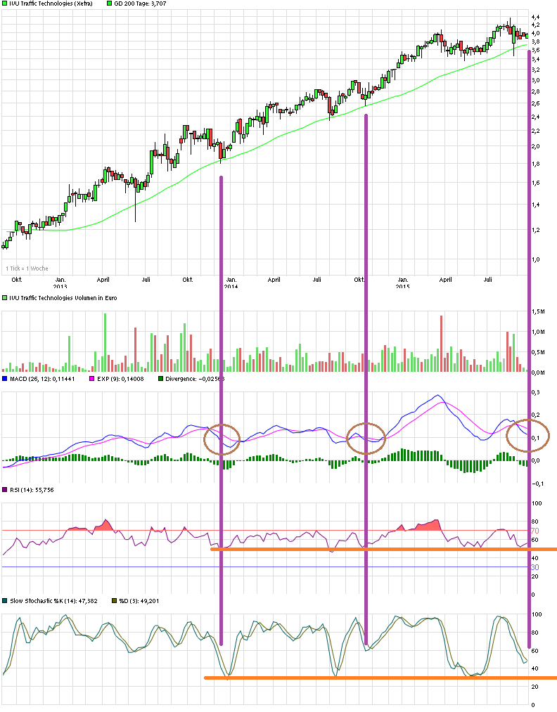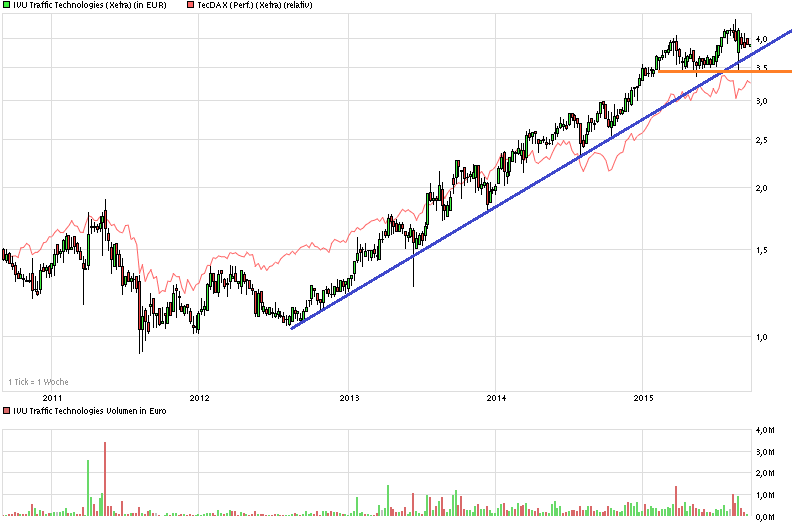 Ich geh davon aus, dass der Trend bei knapp 3,70-3,75 (und erst recht die Unterstützung bei 3,43-3,55) in den nächsten Wochen halten wird und der Kurs dann wie in den letzten 3 Jahren ab Mitte Oktober deutlich nach oben gehen wird. Der Trend ist auch flach genug, um noch 1-2 weitere Jahre erhalten zu bleiben, zumindest wenn man wie ich davon ausgeht, dass IVU 6-7 € pro Aktie wert ist. 6 € schon fürs laufende Geschäftsjahr, 7 € für die voraussichtliche Situation am Ende des kommenden Jahres.