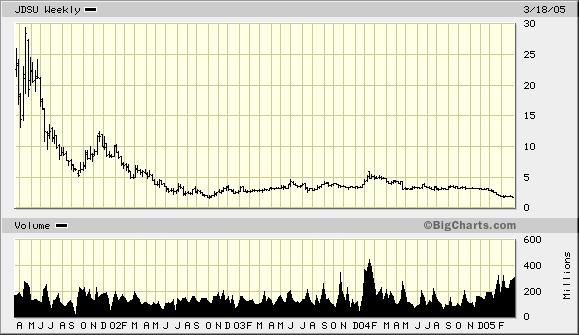 Am Freitag habe ich mir für 1,74 Dollar einige JDS Uniphase (JDSU) zugelegt. Der kanadische Telekomausrüster (Laser- und Glasfaser-Technik) hat einen bemerkenswerten Absturz hinter sich. Im März 2000 notierte die Aktie, getrieben vom Internet-Boom, im Hoch bei 135 Dollar. Seitdem ging es gnadenlos bergab.