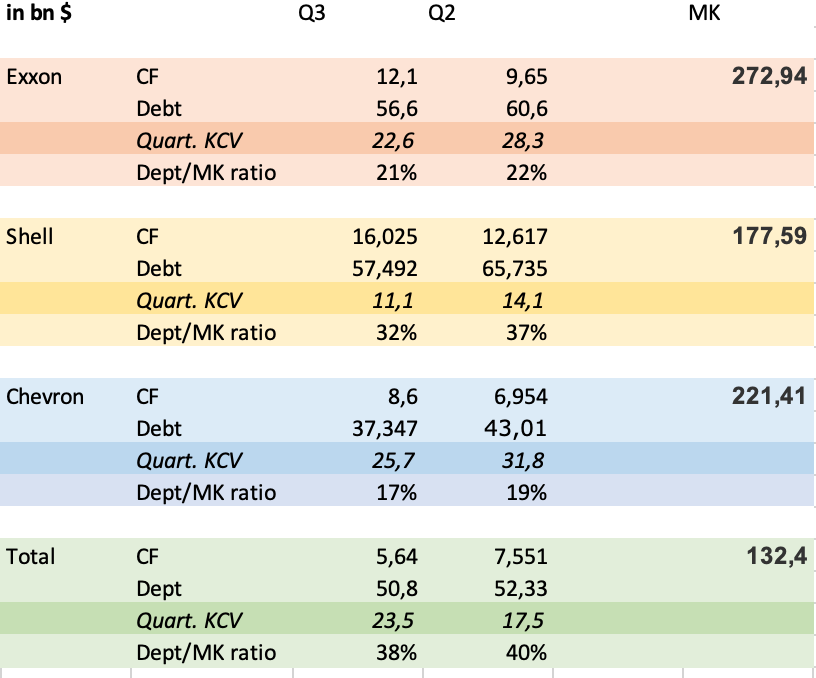 Von den Langfristdaten aber auch vom Geschäft gefällt mir Exxon am schlechtesten.Klar, man steht blendet da aktuell und hat die Bilanz scheinen lassen. Man hat eine tolle Divi, für Anleger zur Zeit attraktiver. Aber man hat den gleichen absoluten Schuldenstand wie Shell, reduziert aber nur um 50% und sogar weniger als die geringer verschuldete Chevron. DAs Schulden /CF Verhältnis ist zur Zeit deutlich geringer.