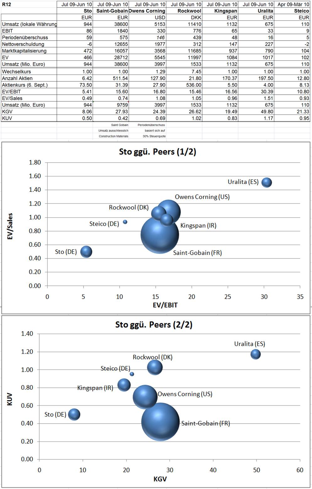 Das Unternehmen verzeichnete 2009 einen Konzernumsatz von 924,6 (946,7) Mill. Euro, ein Minus von 2,3%. Dabei stieg der Inlandsumsatz um 4,5% auf 450,6 (431,1) Mill. Euro. Allerdings zeigte sich ein negativer Trend im Auslandsgeschäft: Hier sank der Umsatz um 8,1% auf 474,0 (515,6) Mill. Euro ab. Das im Ausland realisierte Geschäft der Sto AG lag damit bei 51,2 (54,5)% des Konzernumsatzes. Die Erlöse in Westeuropa (inklusive Deutschland) kletterten 2009 auf 751,2 (738,5) Mill. Euro, während die Umsätze in Nord- und Osteuropa auf 91,3 (114,3) Mill. Euro und in Amerika und Asien auf 82,1 (93,9) Mill. Euro zurückfielen. Mit Fassadenbeschichtungen setzte Sto 216,0 (224,0) Mill. Euro, mit Fassadensystemen 459,1 (457,7) Mill. Euro, mit Innenraumlösungen 128,9 (134,7) Mill. Euro und mit den übrigen Geschäftsfeldern 120,6 (130,3) Mill. Euro um. Der Verwaltungsaufwand erhöhte sich leicht auf 34,15 (33,14) Mill. Euro sowie der Personalaufwand auf 240,2 (235,1) Mill. Euro, während der Materialaufwand auf 408,3 (429,6) Mill. Euro begrenzt wurde. Die Abschreibungen blieben mit 24,47 (24,43) Mill. Euro auf Vorjahresniveau und das Zinsergebnis verbesserte sich leicht auf minus 2,92 (minus 3,97) Mill. Euro. Das Ergebnis vor Steuern stieg auf 78,86 (76,37) Mill. Euro. Unter dem Strich blieb ein Konzernjahresüberschuss von 55,39 (51,73) Mill. Euro. Das Ergebnis je Aktie gibt das Unternehmen mit 8,60 (8,03) Euro je Stammaktie und 8,66 (8,09) Euro je Vorzugsaktie an. Wie im Vorjahr wurde zur unveränderten Dividende von 0,25 Euro je Stamm- und 0,31 Euro je Vorzugsaktie auch ein Bonus von jeweils 2,06 Euro ausbezahlt.
