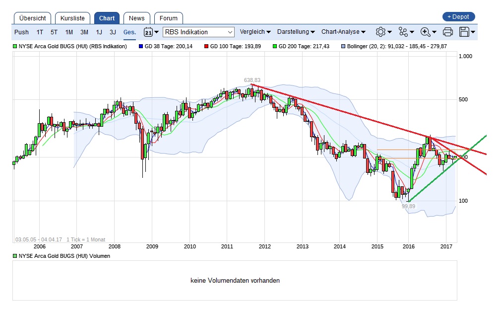 Gold steht aktuell bei 1536 USD, der HUI bei 496. Daraus ergibt sich ein günstiges Ratio von 0,323.