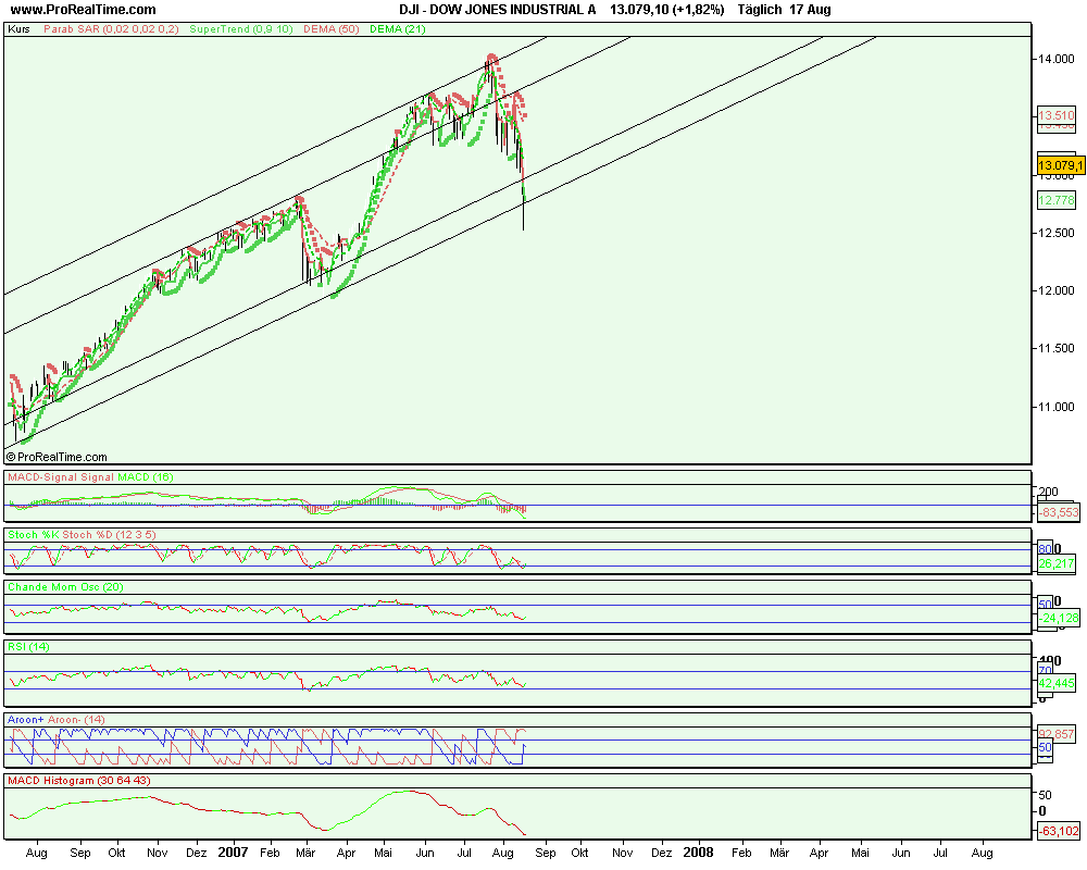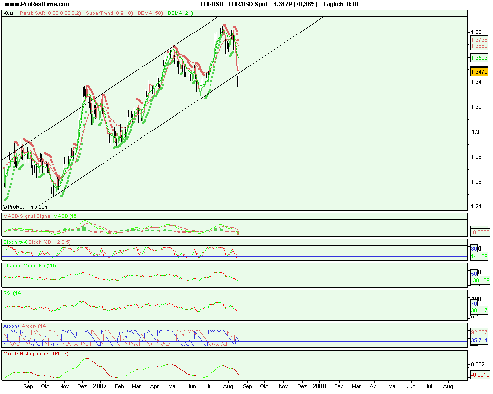 Die Unternehmen werden dieser Entwicklung dann lediglich durch Kostenreduzierungen entgegenwirken können, sprich, es werden wieder mehr Menschen entlassen. Das wiederum wirkt sich verschärfend auf den sowieso geschwächten Konsum aus. Die Spirale dreht sich weiter. Der Binnenkonsum, in den USA immer noch der wichtigste Wirtschaftsmotor, wird in Folge seine Wachstumsraten nicht mehr beibehalten können.Das bedeutet, Ben Bernanke muss eigentlich alles tun, um den Dollar einigermaßen stabil zu halten. Ansonsten würde er über eine Verteuerung der Kosten des täglichen Bedarfs eine Konsumzurückhaltung bewirken, die im Bereich des mittel- und langfristigen Bedarfs zu einer Ausweitung der Deflation führt. Eine solche wird auf der einen Seite die Gewinne der Unternehmen und auf der anderen Seite den Arbeitsmarkt belasten. Auch aus diesem Grund denke ich nicht, dass die Fed die Zinsen zu stark senken wird/kann. Ich sorge mich nur, dass der Markt das zu „plötzlich“ begreifen und in Folge zu stark reagieren könnte.