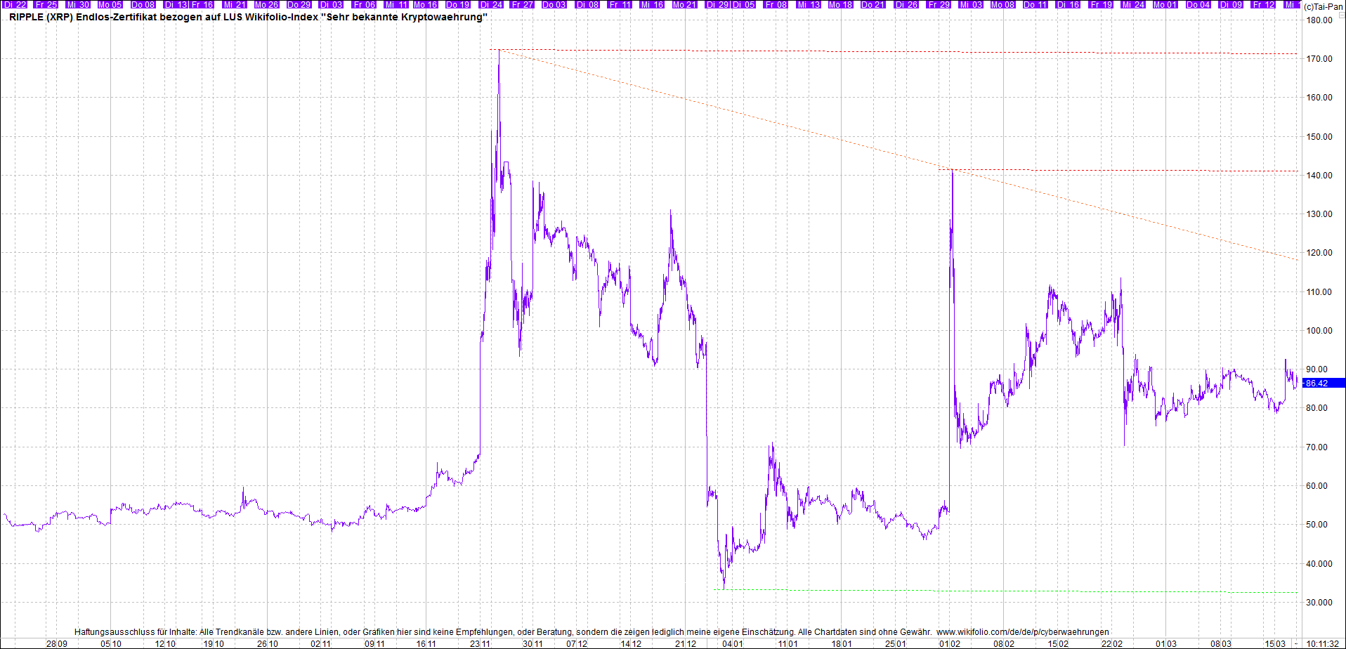 Das dazu passende Ripplezertifikat, ist bekannt als: Endlos-Zertifikat bezogen auf LUS Wikifolio-Index "Sehr bekannte Kryptowaehrung".