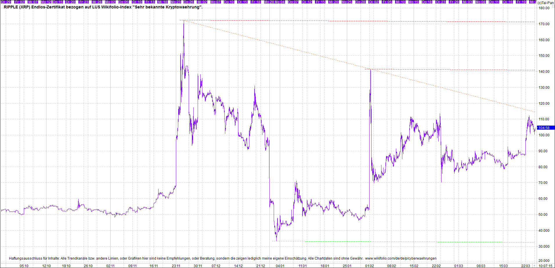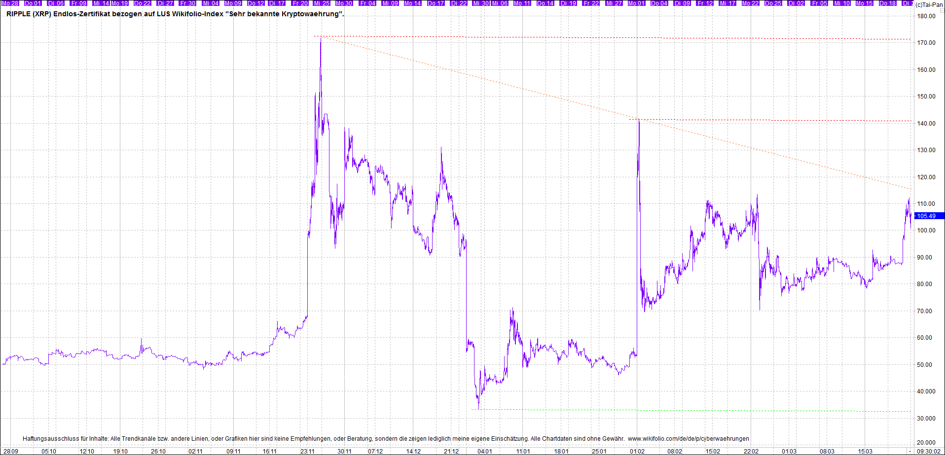 Das dazu passende Ripplezertifikat, ist bekannt als: Endlos-Zertifikat bezogen auf LUS Wikifolio-Index "Sehr bekannte Kryptowaehrung".