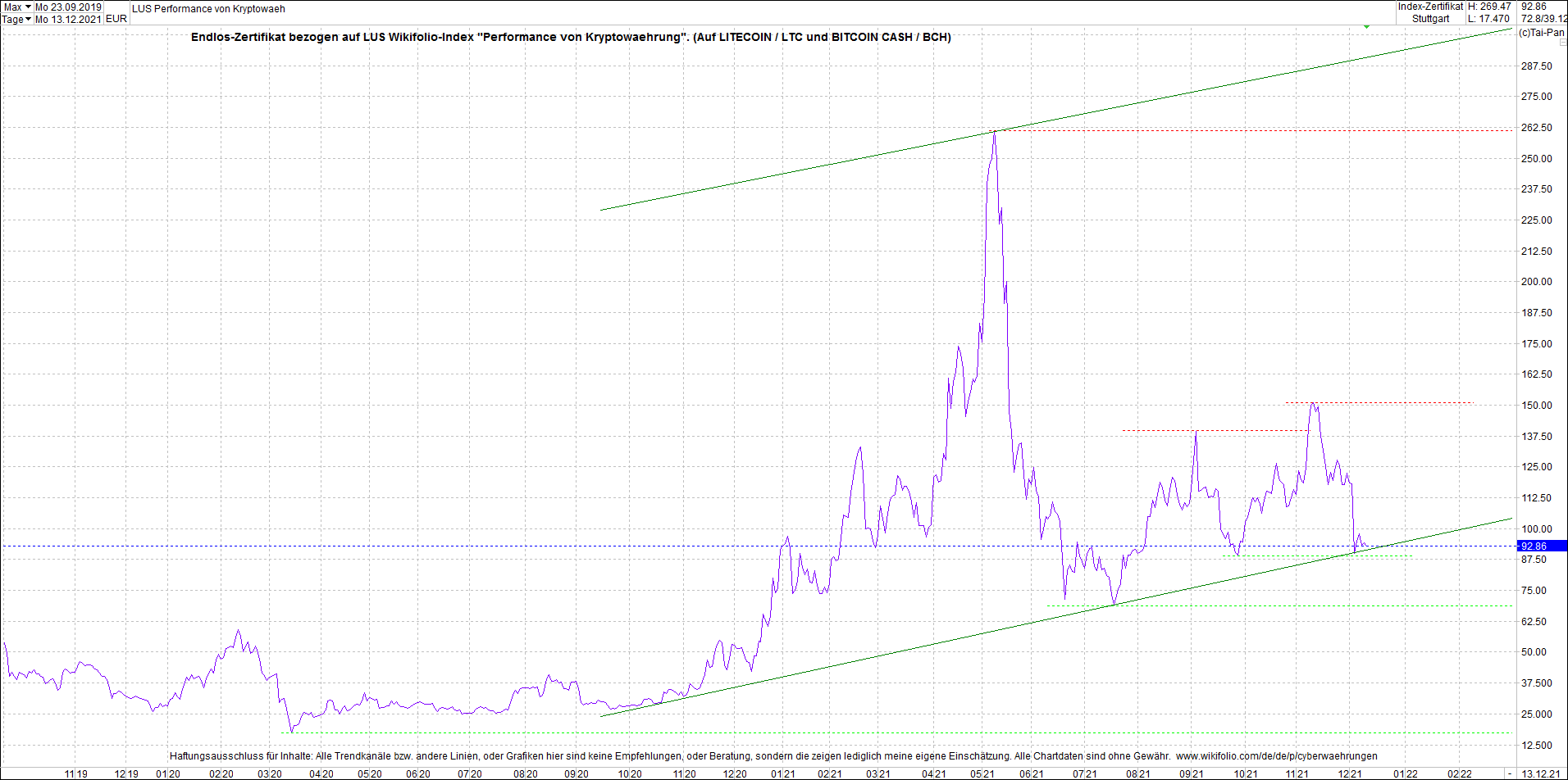 Anbei das Zertifikat, bekannt als: Endlos-Zertifikat bezogen auf LUS Wikifolio-Index "Performance von Kryptowaehrung",  jetzt versorgt mit Performance von Litecoin (LTC) und von Bitcoin Cash (BCH).