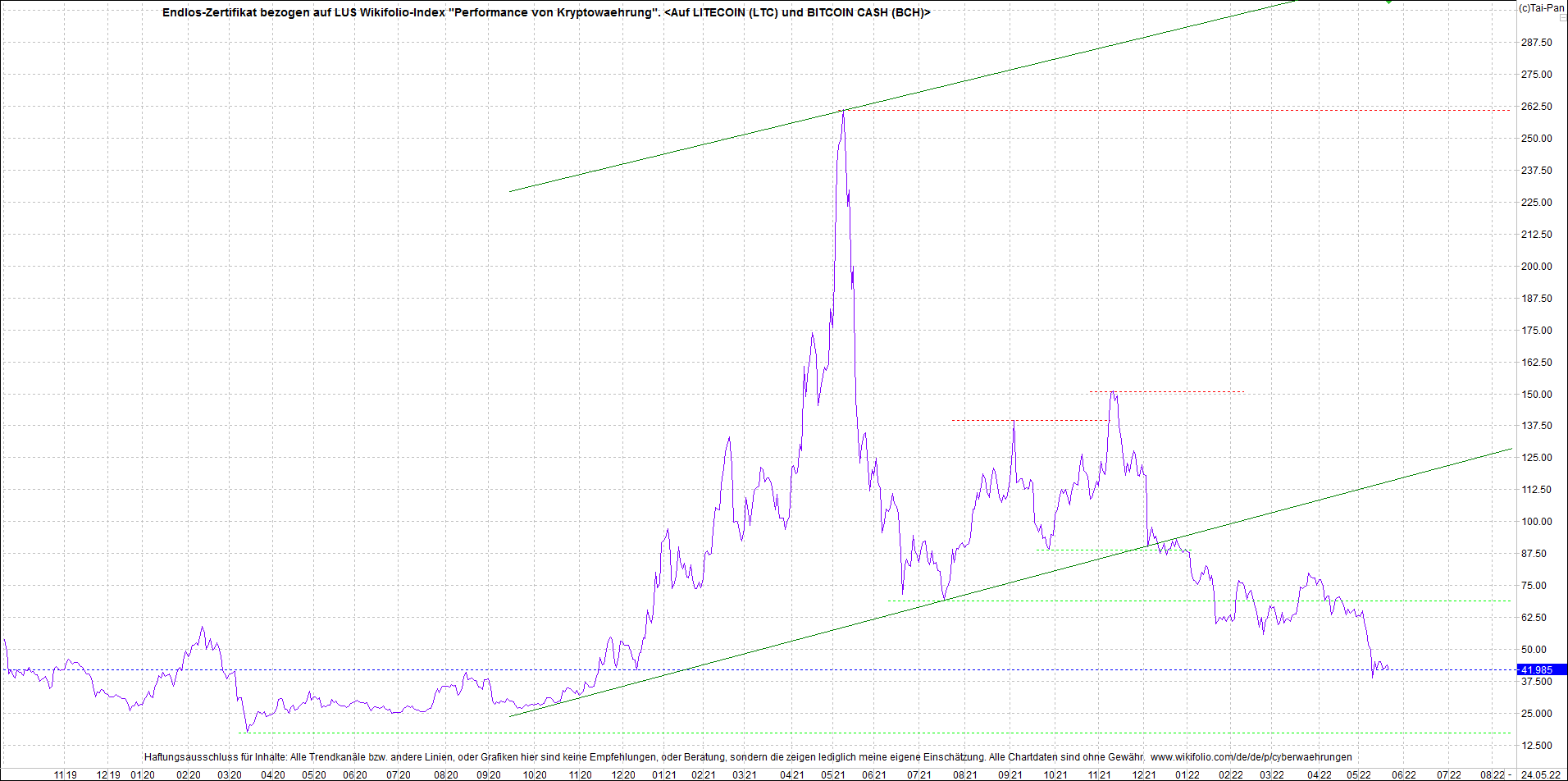 Anbei das Zertifikat, bekannt als: Endlos-Zertifikat bezogen auf LUS Wikifolio-Index "Performance von Kryptowaehrung",  jetzt versorgt mit Performance von Litecoin (LTC) und von Bitcoin Cash (BCH).